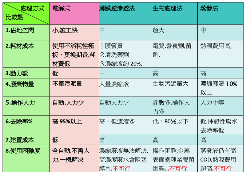 緣此本公司特別研發高濃度COD電解機,針對有COD處理困擾的廠商提供一個最佳的解決方案,其原理乃是利用電流在極板產生的氧化作用來強力氧化COD,具有操作簡單,用地面積小,設備成本低等優點;其特色和優點與其他的處理方法利用下表比較如下: